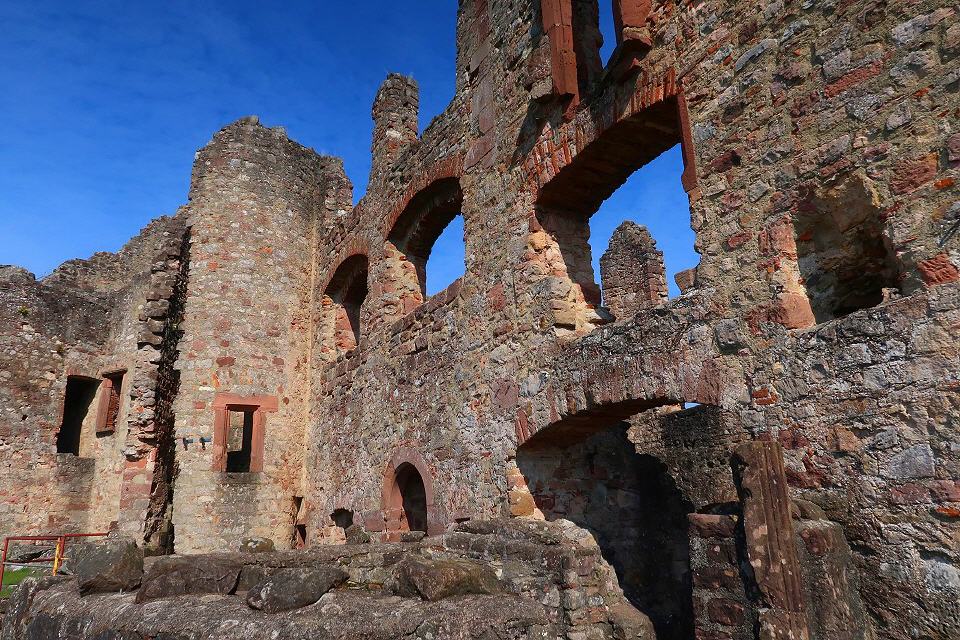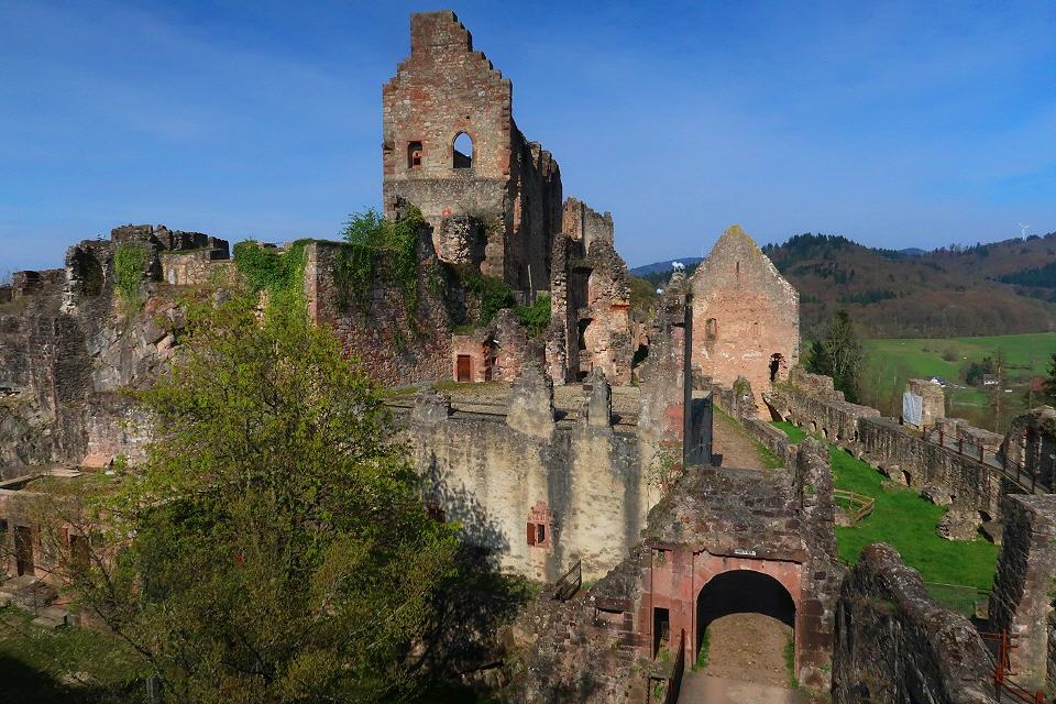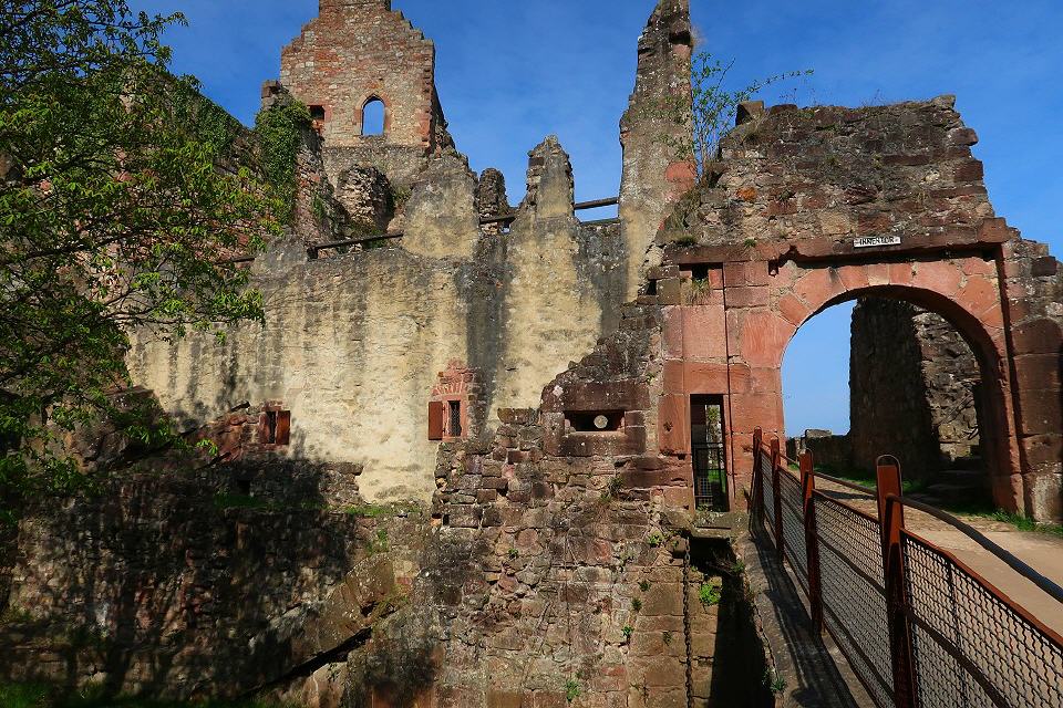 Nun sind es nur noch 450 m bis zur südlichen Bastion der Hochburg. Über eine Treppe und einen dunklen Mauerdurchgang kann man sie durchqueren. Beim Besuch der weitläufigen Anlage, die die zweitgrößte Burg Badens nach dem Heidelberger Schloss ist, empfiehlt es sich, auf die Färbungen der Mauerquader und auf die an vielen Stellen erschlossenen anstehenden Sandsteinschichten zu achten.