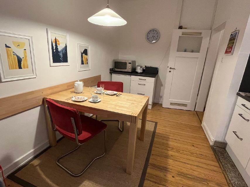 Küche mit gemütlichem Essplatz, 2-Platten-Induktionsherd, Waschmaschine, Kaffeemaschine, Toaster, Mikrowelle (mit Backofen) sowie allem notwendigem Geschirr etc. für bis zu 4 Personen
