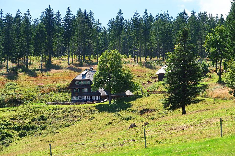 Kurz nachdem wir in den Wald kommen, führt der Weg von der Straße auf einem kleinen Pfad vorbei an einer weiteren Schanzenanlage. Über offenes Feld führt der Weg hinab zum Ochsenhof. Der Schwarzwaldhof wurde im Jahre 1700 erbaut, in den letzten Jahrzehnten renoviert und steht heute unter Denkmalschutz. Mit seinem weit heruntergezgenen Dach fügt er sich sehr gut in die Landschaft des Naturschutzgebietes Rohrhardsberg ein. Von hier führt der Weg parallel zum Bach steil bergab in die ehemalige Ortsmitte von Rohrhardsberg mit dem alten Schul- und Rathaus und einigen ehemaligen Waldarbeiterhäusern. Rohrhardsberg wurde erstmals 1335 als Rohartesberg urkundlich erwähnt. Im ausgehenden Mittelalter gehörte Rohrhardsberg zur Herrschaft Triberg und kam mit der Herrschaft an das Haus Habsburg. Mit dem Großherzogtum Baden wurde Rohrhardsberg selbstständig. 1971 wurde es zu Schonach eingemeindet.