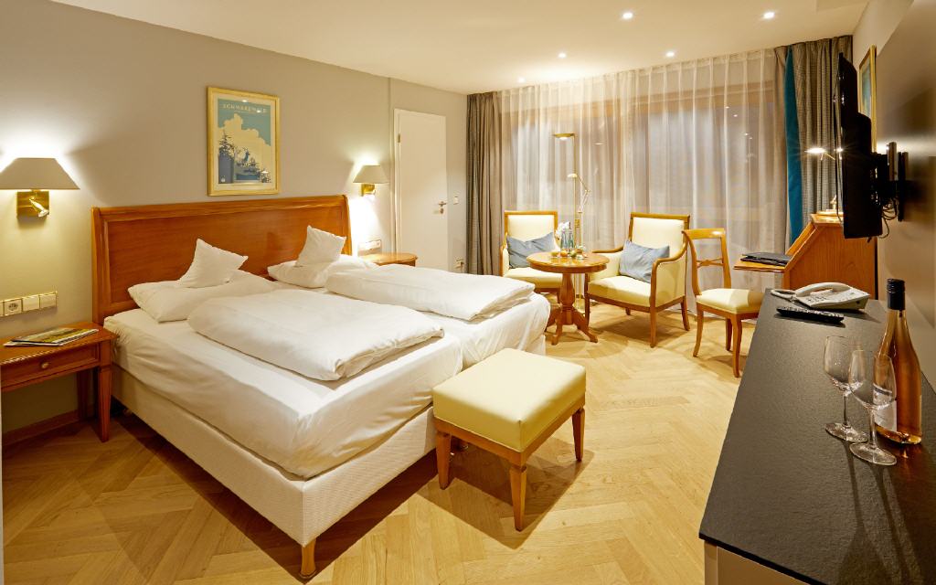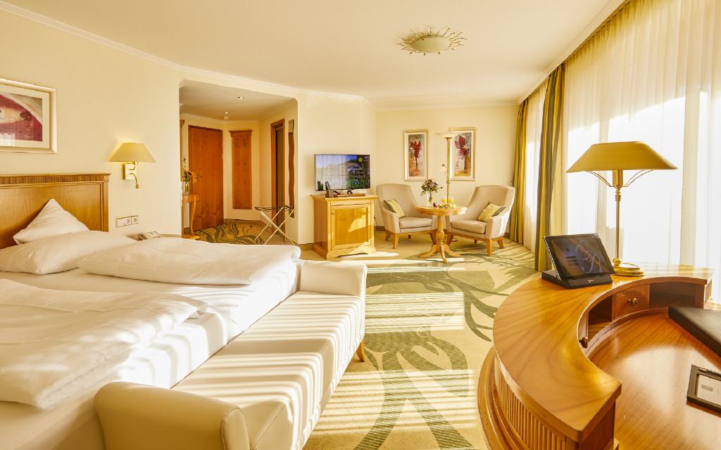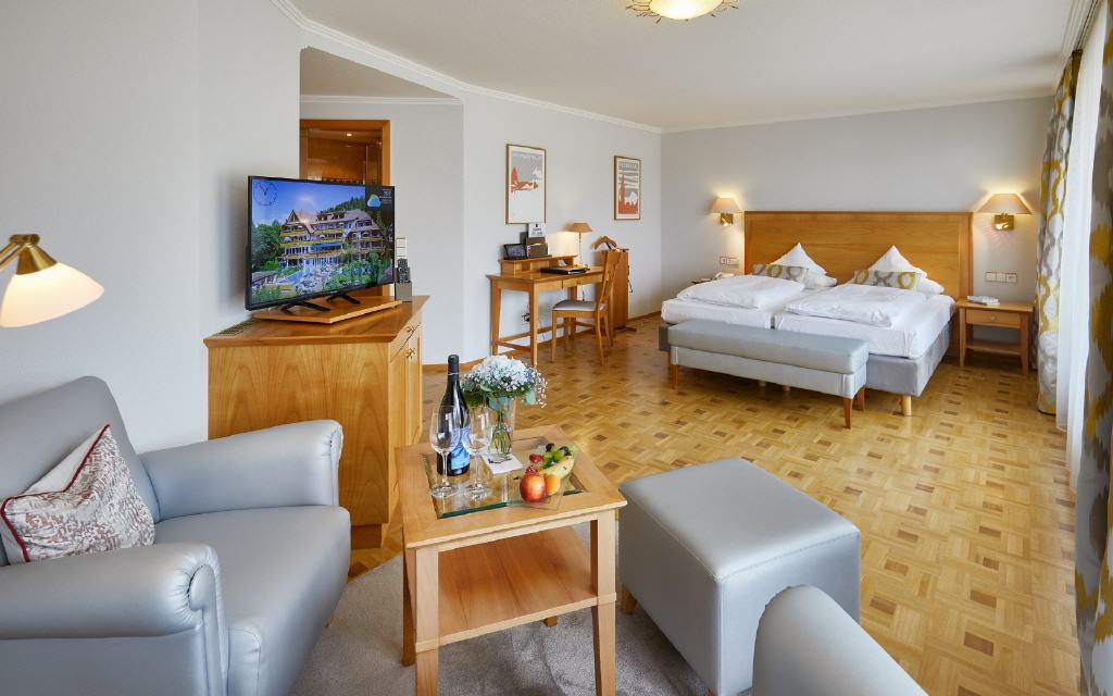 Junior-Suite Glottertal. Junior-Suite, 48 qm, möblierter Balkon 12 qm oder Loggia 6 qm, Südwestseite zum Garten, mit Nachmittags- und Abendsonne. Das Interieur dieser beiden Suiten verzaubert Sie mit geschmackvollem Landhausstil gepaart mit modernem Edel-Touch: Die Suiten Glottertal bestichen durch ihre unaufdringliche Behaglichkeit in einem perfekt abgestimmten Mix aus charmanten Stilelementen. Warme Hölzer und heitere Farben schaffen ein behagliches Wohn-Ambiente. Ein geräumiges und ruhiges Doppelzimmer mit Nachmittags- und Abendsonne, das Ihnen einen herrlichen Blick auf die gepflegten Gartenanlagen gewährt.