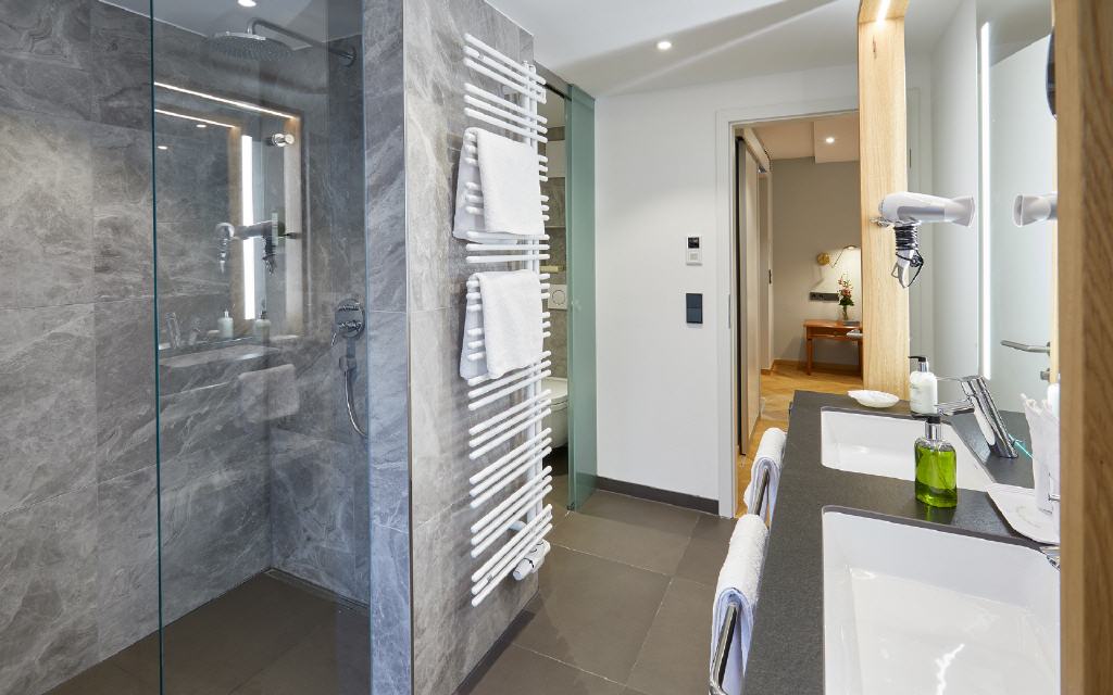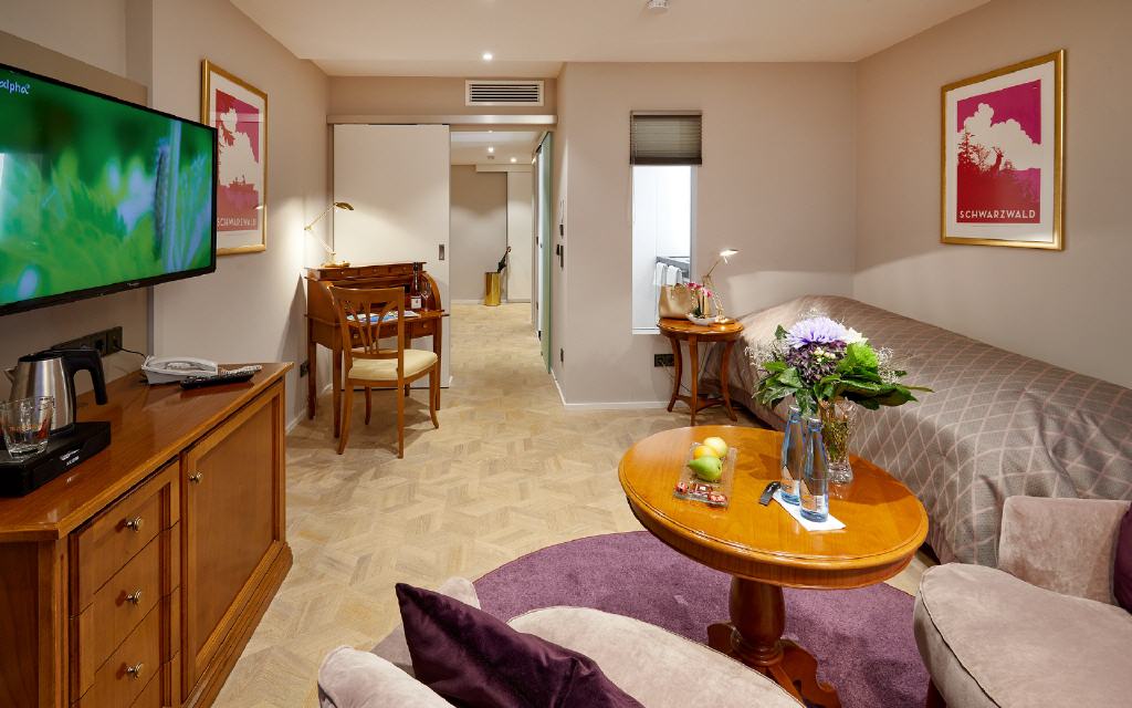 Suite Dreisamtal. Exklusive Suite 55 qm, Balkon 6 qm, Südwestseite zum Garten. Die Dreisam-Tal-Suiten versprichen ein exklusives Wohnerlebnis mit heimischem Flair: Die großzügig geschnittenen Suiten mit modernem Badezimmer bieten neben vielen Verwöhn-Extras auch einen besonderen Komfort durch die Möglichkeit, das Wohnzimmer auf Wunsch als zweites Schlafzimmer mit Einzelbett zu nutzen. Ideal für getrennt schlafende Paare oder auch für 3 Personen. Sorgfältig ausgewählte Details betonen die gehobene Extraklasse.