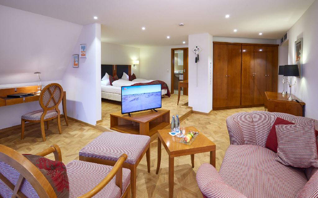 Jedes Zimmer und jede Suite ist mit Smart-TV, Mediathek, Radio, Tablet und WLAN ausgestattet. Design-Echtholzmöbel, Eiche-Echtholzparkett, exklusive Stoffe von JAB, hochwertige Box-Springbetten mit bandscheibengerechten Matratzen, Sitzecke, Minibar, Safe sowie ein elektrischer Hosenbügler sorgen in allen Zimmern für eine höchstkomfortable Erholung.