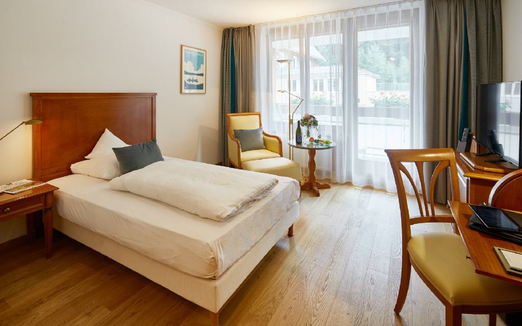 Einzelzimmer Scheibenfelsen. Einzelzimmer 36 bis 42 qm, Loggia 4 qm, Waldseite mit Morgensonne. Das ideale Zimmer für Single-Urlauber mit besonderen Ansprüchen an Raum und Komfort. Freuen Sie sich beim Aufwachen im Super Grand Lit (160 x 200 cm) über die Morgensonne von der Waldseite und abends über die erfrischende Kühle an heißen Sommertagen. Das Zimmer kann auf Wunsch über eine Zwischentür mit dem danebenliegenden Einzelzimmer Scheibenfelsen verbunden werden.