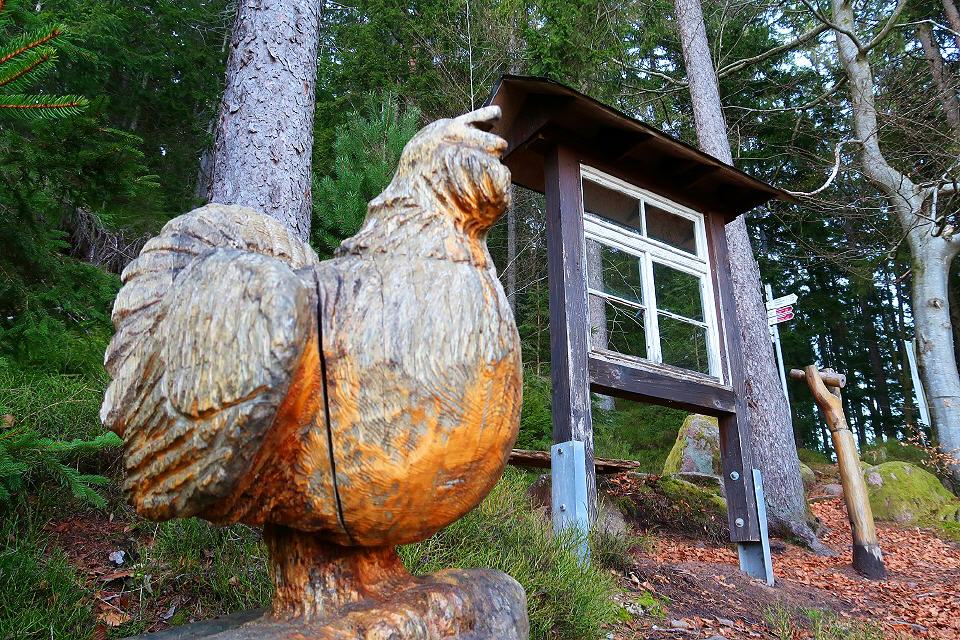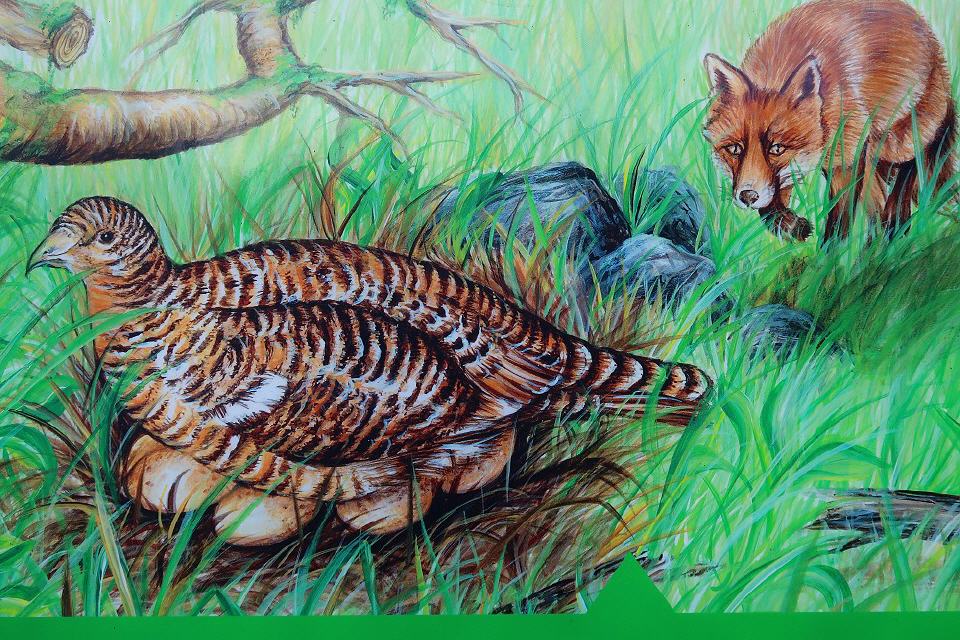 Anfang des 20. Jahrhunderts gab es in diesem Gebiet eine große Auerhahn-Population. Stationen wie das Auerhuhn-Nest, der Schlafplatz und der Balzplatz sind mit großen Installationen versehen. Infortafeln vermitteln Wissenswertes beispielsweise über den Lebensraum der größten Hühnervögel Mitteleuropas.