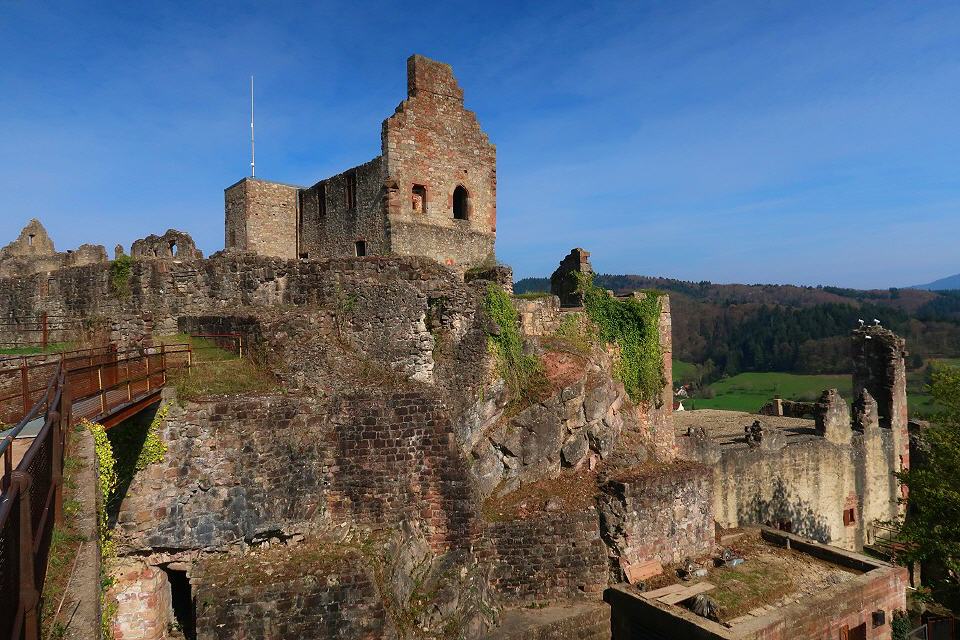 Nun sind es nur noch 450 m bis zur südlichen Bastion der Hochburg. Über eine Treppe und einen dunklen Mauerdurchgang kann man sie durchqueren. Beim Besuch der weitläufigen Anlage, die die zweitgrößte Burg Badens nach dem Heidelberger Schloss ist, empfiehlt es sich, auf die Färbungen der Mauerquader und auf die an vielen Stellen erschlossenen anstehenden Sandsteinschichten zu achten.