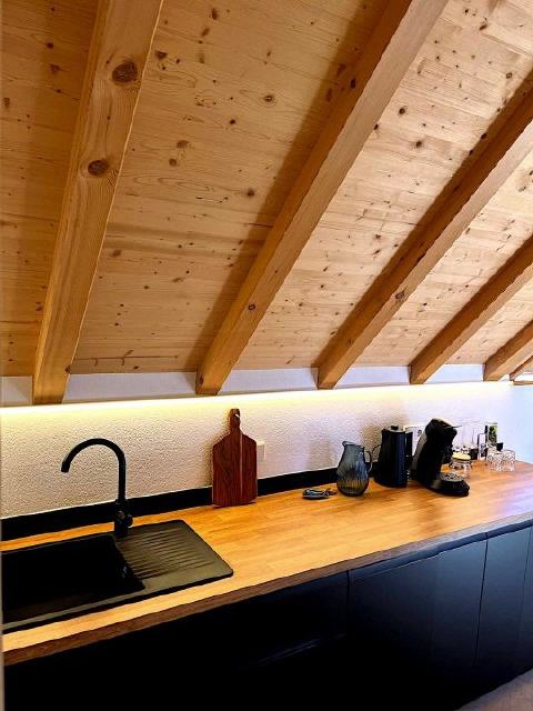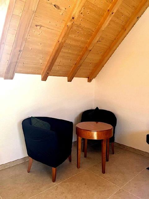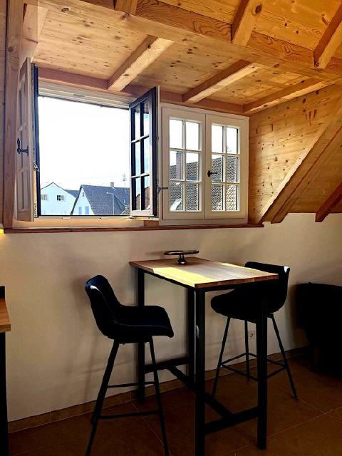 Zwei gemütliche Sessel mit Teetisch laden zum Entspannen ein. Ein Echtholz Hochtisch mit zwei drehbaren Hochstühlen eignen sich für Frühstück und Brotzeiten in privater Atmosphäre.