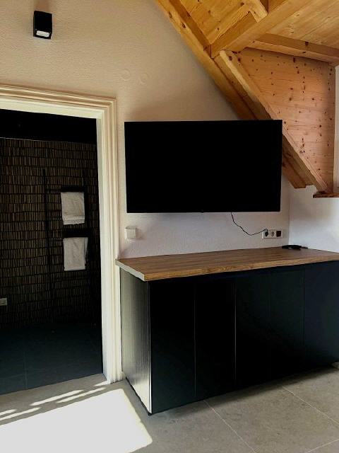 Ein 55 Zoll SmartTV mit einer Kommode für weiteren Stauraum runden das große Zimmer ab.