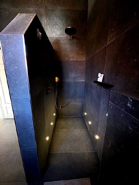 Badezimmer: Design-Bad mit bodentiefer Regendusche, Ambientelicht, Echtstein-Waschtisch und beleuchtetem Spiegel.
