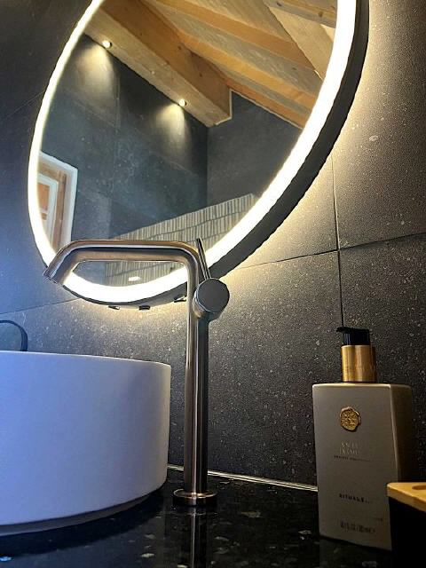 Ein absolutes Highlight ist das Design Bad: Die bodentiefe Regendusche mit Ambientelicht auf Bewegung sowie das hochwertige Aufsatzwaschbecken mit Echtsteinplatte und beleuchtetem Spiegel.