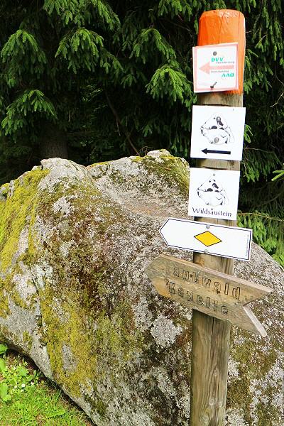 7. Wildsaustein. 300 Meter westlich vom Eulenstein ist der Holzeck erreicht. Der Asphaltstraße folgend stoßen wir zu einem der schönsten Aussichtspunkte um Schonach. In dieser aussichtsreichen Lage steht der Wildsaustein. Der Stein gleicht seinem namensgebenden Tier. Auf der Oberseite ist eine 65 cm große Schale mit breitem östlichen Auslauf zu finden. Dieser Stein dient auch als Grenzstein. In unmittelbarer Nähe am Waldrand lädt eine Sitzbank zum Rasten ein und bietet einen schönen Ausblick auf die Schwarzwaldlandschaft.