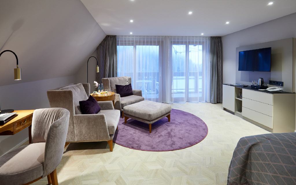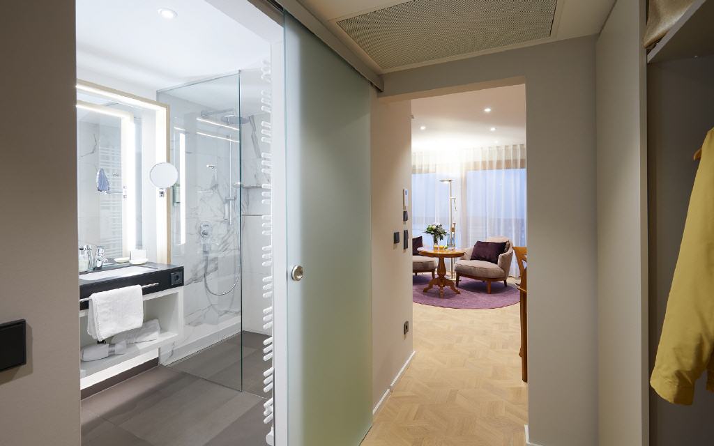 Suite Dreisamtal. Exklusive Suite 55 qm, Balkon 6 qm, Südwestseite zum Garten. Die Dreisam-Tal-Suiten versprichen ein exklusives Wohnerlebnis mit heimischem Flair: Die großzügig geschnittenen Suiten mit modernem Badezimmer bieten neben vielen Verwöhn-Extras auch einen besonderen Komfort durch die Möglichkeit, das Wohnzimmer auf Wunsch als zweites Schlafzimmer mit Einzelbett zu nutzen. Ideal für getrennt schlafende Paare oder auch für 3 Personen. Sorgfältig ausgewählte Details betonen die gehobene Extraklasse.