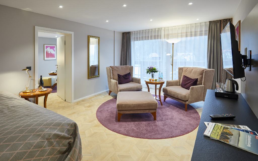 Jedes Zimmer und jede Suite ist mit Smart-TV, Mediathek, Radio, Tablet und WLAN ausgestattet. Design-Echtholzmöbel, Eiche-Echtholzparkett, exklusive Stoffe von JAB, hochwertige Box-Springbetten mit bandscheibengerechten Matratzen, Sitzecke, Minibar, Safe sowie ein elektrischer Hosenbügler sorgen in allen Zimmern für eine höchstkomfortable Erholung.