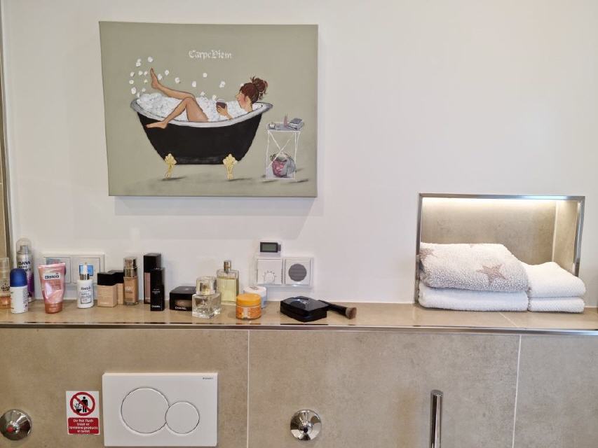 Die großzügige Komfort-Whirl-Badewanne „Lupor“ mit Air-System, 12 Luftdüsen und zusätzlicher Stabbrause lädt Sie zum Entspannen ein. Relaxen und genießen Sie in unserer luxuriösen Whirlwanne , die für 2 Personen groß genug ist. Im separaten 1,20 m großen, bodengleichen Duschbereich können Sie hinter der Designer-Glaswand zwischen der 36cm-Raindance-Dusche mit sanftem Brauseregen und luftangereicherten Tropfen oder der Handbrause mit frischem Brausestrahl bzw. kräftigem Massage-Whirlstrahl wählen. Außerdem erwarten Sie ein wandhängendes Tiefspül-WC sowie ein Waschtisch mit Unterschrank. Ein beleuchteter Badspiegel, ein beleuchteter 7fach-LED-Kosmetikspiegel, eine Personenwaage, 2 Haartrockner sowie ausreichend Stauraum und Ablageflächen sind selbstverständlich vorhanden. Die beleuchteten LED-Fächer und Musik aus der ganzen Welt aus dem Wandeinbau-Internetradio schaffen hier eine Wohlfühlatmosphäre zum Verweilen und Entspannen. Neben wichtigen Bad-Accessoires inkl. Duschgel/Shampoo/Kosmetiktücher stellen wir Ihnen für Ihren Aufenthalt pro Person gerne 2 Handtücher zur Verfügung.