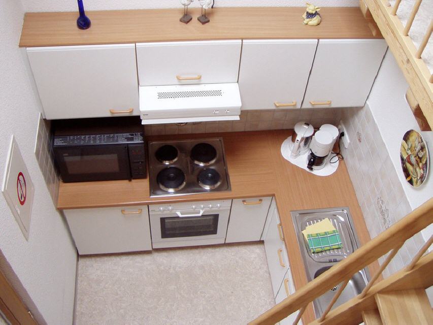 Küchenausstattung: Geschirr, Geschirrtücher, Kaffeemaschine, Senseo-Pad, Wasserkocher, Eierkocher, Toaster, Mikrowelle, 4-Plattenherd, Backofen und Spülmaschine, Bügeleisen und Bügelbrett.