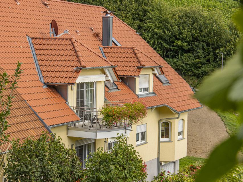 - Ferienwohnung 2 Weinbergblick: Die Ferienwohnung liegt im EG links, südöstlich zur Talseite. Vom großen Balkon (12 qm) hat man einen herrlichen Ausblick.